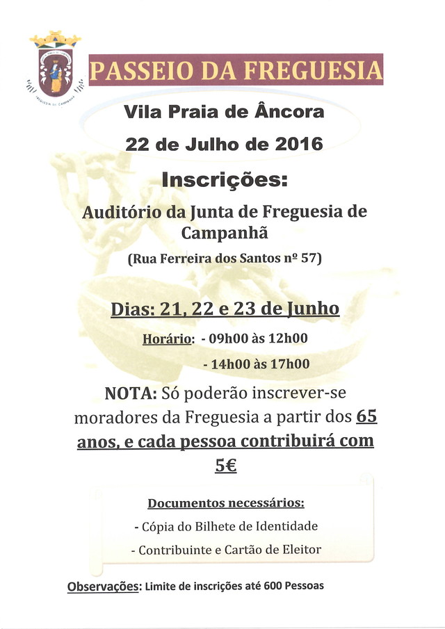 Encontram-se abertas as inscrições para o passeio da 3ª Idade, que irá realizar-se dia 22 de Julho com destino a Vila Praia de Âncora. As inscrições deverão ser feitas no Auditório da Freguesia, na rua Ferreira dos Santos, 57, nos dias 21, 22 e 23 de Junho, das 9h às 12h e das 14h às 17h. Mais informações no cartaz.