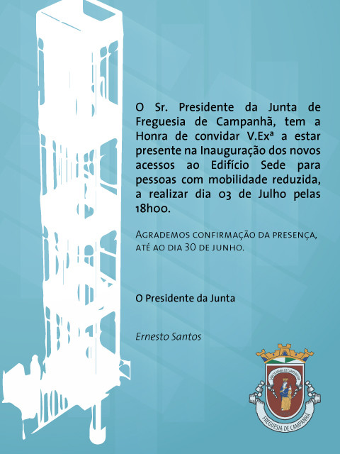 O Sr. Presidente da Junta de Freguesia de Campanhã, tem a Honra de convidar V.Exª a estar presente na Inauguração dos novos acessos ao Edifício Sede para pessoas com mobilidade reduzida, a realizar dia 03 de Julho pelas 18h00.