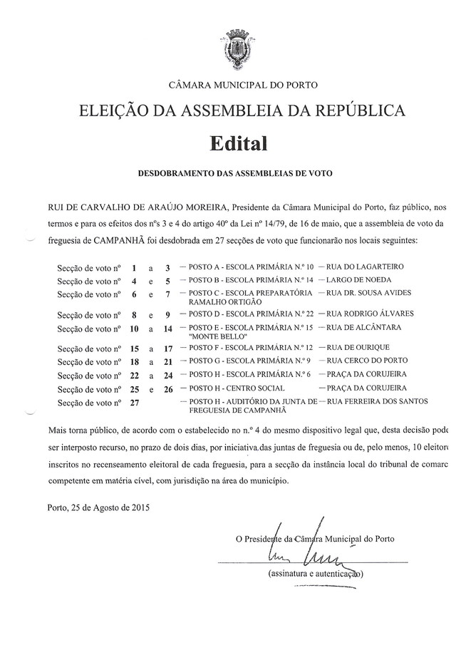 SECÇÕES DE VOTO PARA ELEIÇÃO À ASSEMBLEIA DA REPÚBLICA