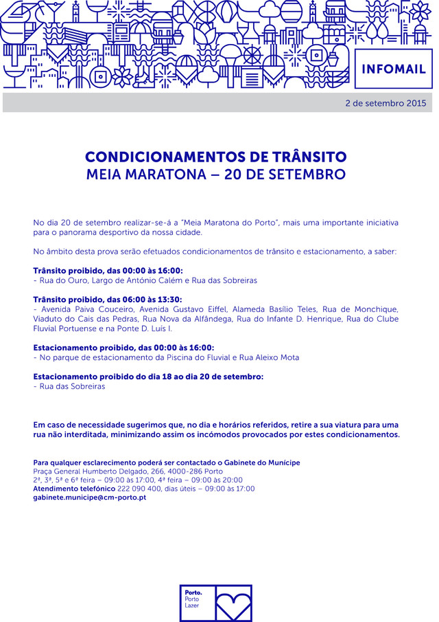 A pedido da entidade Porto Lazer informamos que amanhã, domingo, dia 20 de Setembro, o trânsito estará condicionado em algumas artérias da cidade, de acordo com indicações no cartaz.