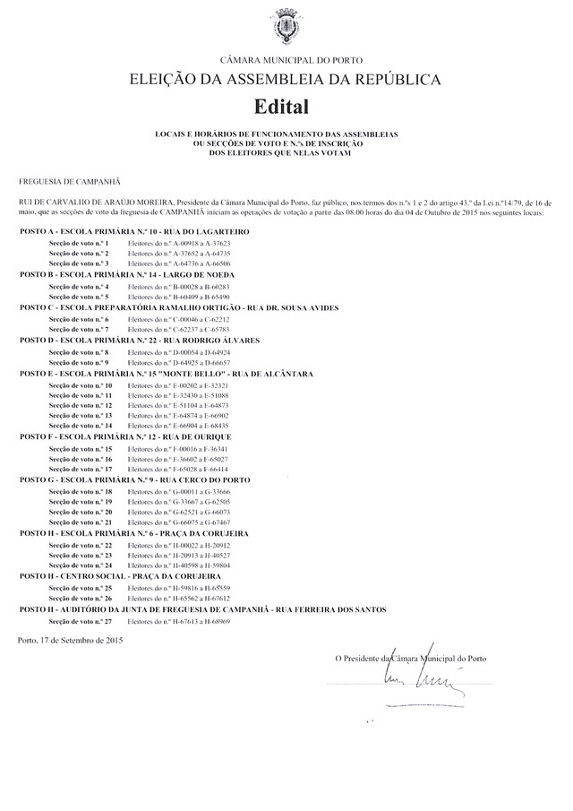 • SECÇÕES DE VOTO PARA ELEIÇÃO À ASSEMBLEIA DA REPÚBLICA